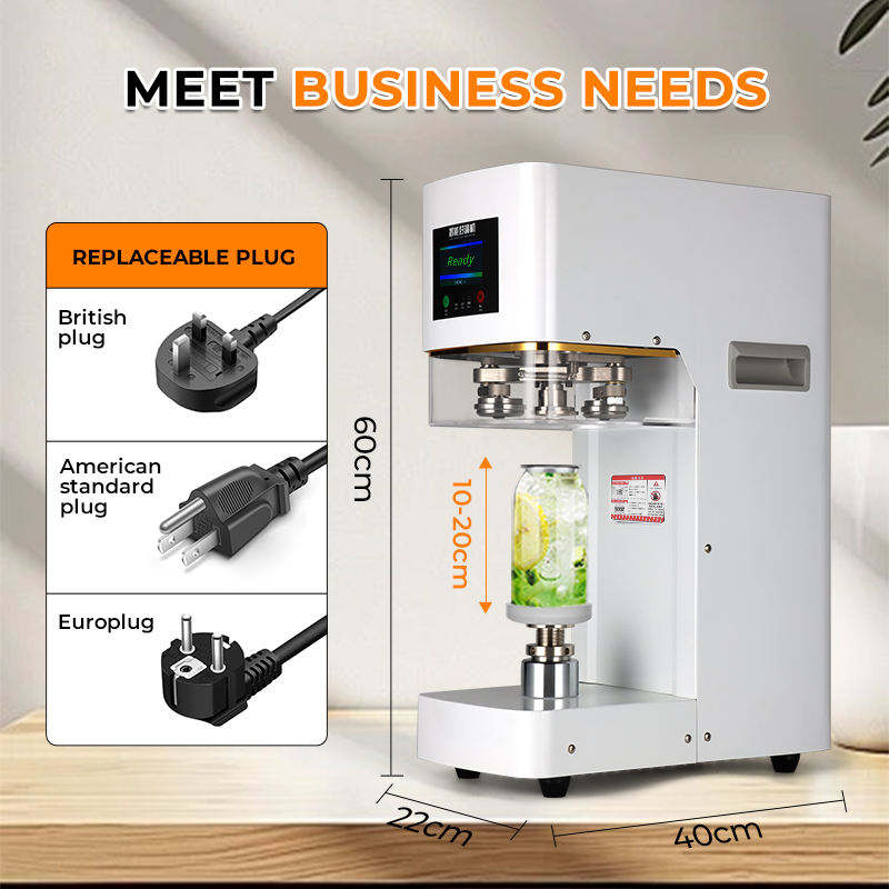 Versatile Compatibility: It is fully compatible with different types of cans, including round, square, and tapered PET cans commonly used in the beverage and cold drink industry. The adjustable sealing head can be calibrated to match can heights from 30mm to 180mm, catering to both standard and customized can sizes with diameter 40-100mm.